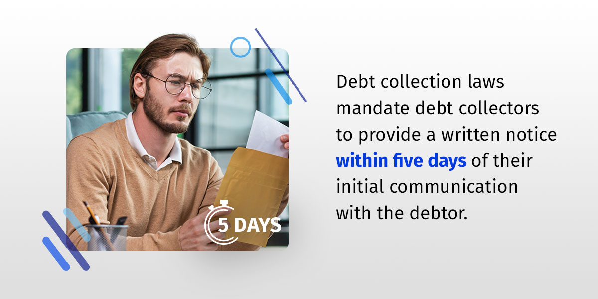 Debt collection laws mandate debt collectors to provide a written notice within five days of their initial communication with the debtor. The notice will typically contain the creditor’s name, the loan amount, the date the debt was incurred, the debtor’s right to dispute the debt and so on.