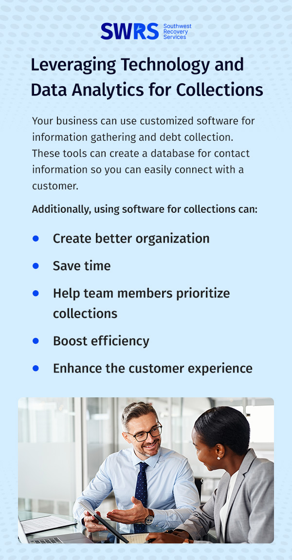 Your business can use customized software for information gathering and debt collection. These tools can create a database for contact information so you can easily connect with a customer. Additionally, software can serve as a tracking method to determine which customers have responded and which ones haven’t received your messages, allowing you to create personalized outreach plans.