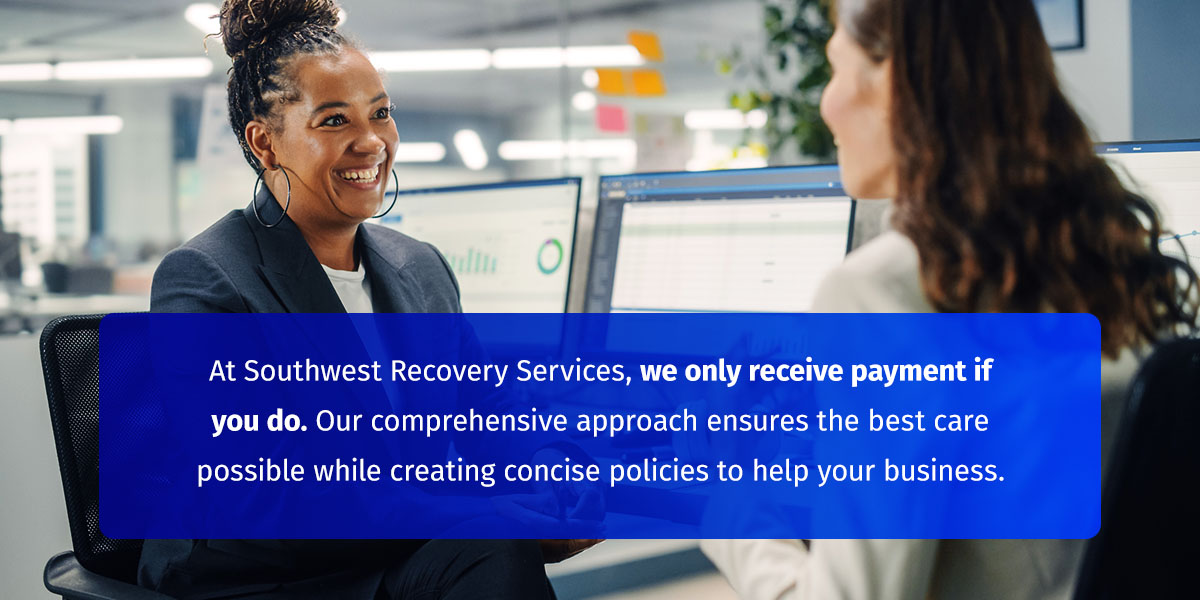 When choosing a partner, it’s essential to understand the terms and conditions of collaboration. For example, at Southwest Recovery Services, we only receive payment if you do. Our comprehensive approach ensures the best care possible while creating concise policies to help your business.